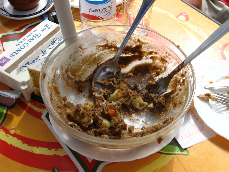 In einem Ausflugsrestaurant essen wir einen ausgezeichneten Gemüseeintopf mit Gofio, dem speziellen kanarischen Mehl aus gerösteter Gerste oder anderen Getreidesorten, und dazu gibt es „papas arugada“ (Runzelkartoffeln), die in der Speisekarte lustigerweise mit „zerknitterte Kartoffel“ übersetzt sind. Das sind kleine ganze Kartoffeln, die in sehr stark gesalzenem Wasser gekocht werden, das man nach dem Kochen verdampfen lässt, wodurch sich eine schöne Salzkruste bildet. Die Kartoffelschalen werden da ganz runzelig, weshalb sich der Name Runzelkartoffeln erklärt.