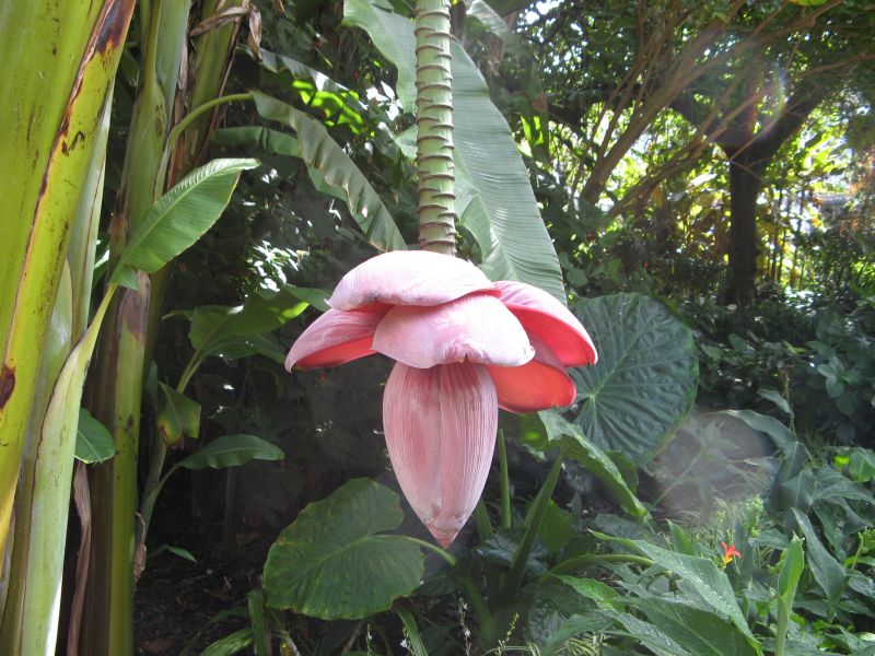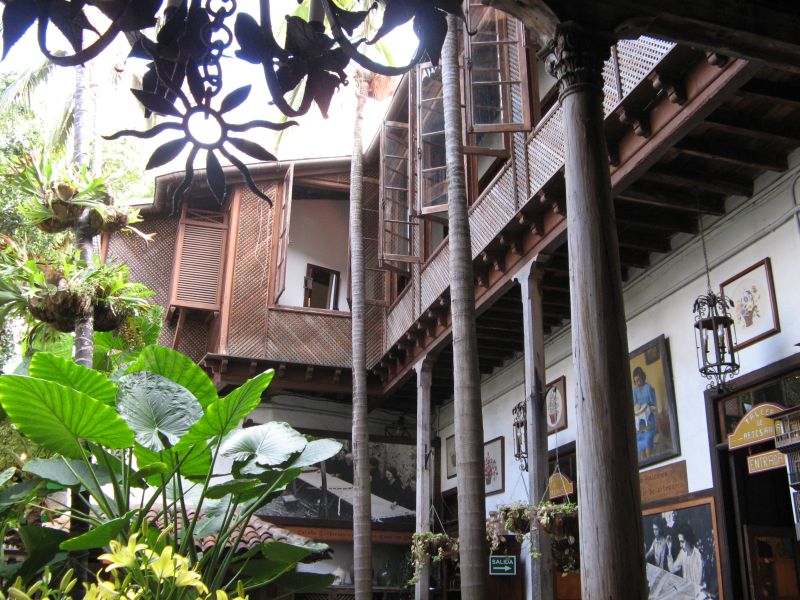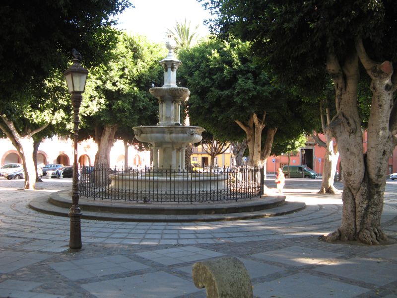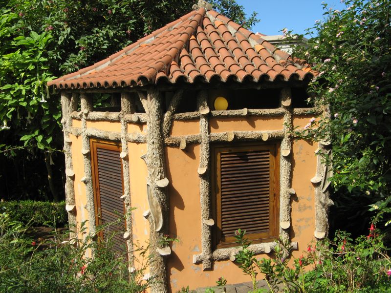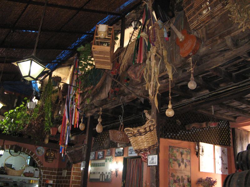 Am Freitag besichtigen wir zuerst La Orotava. Dieser Ort ist einerseits für seine botanischen Gärten und andererseits wieder für die Häuser mit den Balkonen berühmt. Der botanische Garten hinter dem Rathaus ist wirklich sehr schön. Mittendrin spricht uns ein Deutscher an und empfiehlt uns eine Bodega, die etwas abgelegen vom Stadtzentrum ist. Dort gäbe es wirklich original kanarische Küche, heute zum Beispiel Kaninchen. Da es bereits Mittag ist, läuft uns bei seinen Beschreibungen gleich das Wasser im Mund zusammen und wir gehen sofort zu diesem Gasthaus. Der Vorraum ist eine Schank, wo einige ältere Männer ihr Bier trinken, dahinter befindet sich der Speisesaal in einem überdachten Innenhof hinten die Küche und oben rechts verläuft ein Balkon. Der Speiseraum ist schön rustikal mit Holzbänken und Holztischen, die mit Plastiktischtüchern bedeckt sind. Die Wände sind dicht mit Bilder und anderem Dekor geschmückt, vom Balkon hängen getrocknetes Gemüse, Musikinstrumente, Vogelkäfige und vieles mehr. Und das Essen dort ist wirklich köstlich. Wir nehmen jeder das Menü. Ich bekomme statt Kaninchen ein Hühnchen. Denn ich kann kein Kaninchen essen ohne an den Zwerghasen zu denken, den wir als Kinder für kurze Zeit hatten (der dann in Wirklichkeit ein gewöhnlicher Feldhase und zu groß für den Käfig war, weshalb er zu einem Bauern in Pflege kam).
