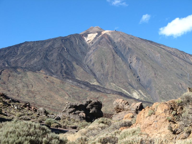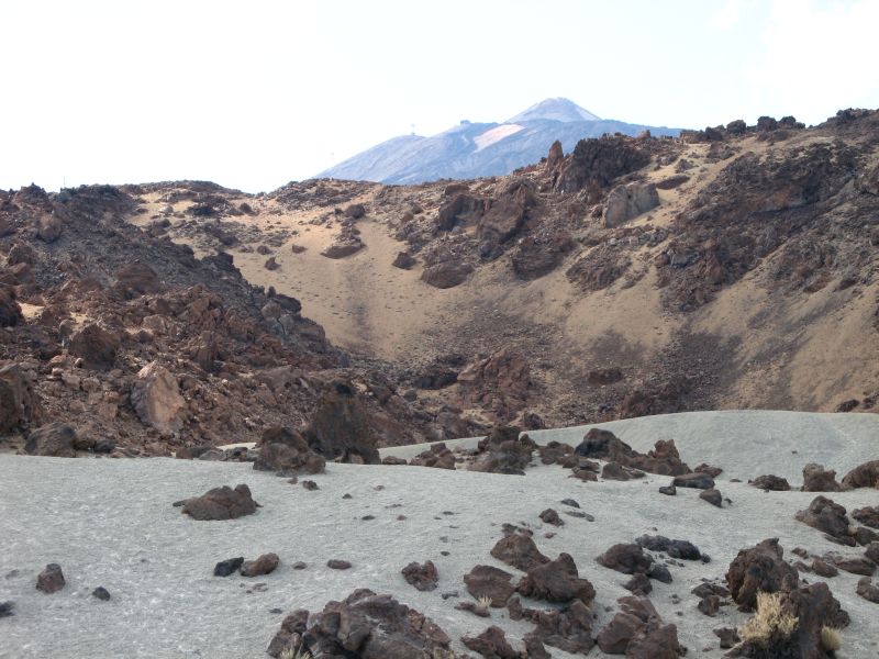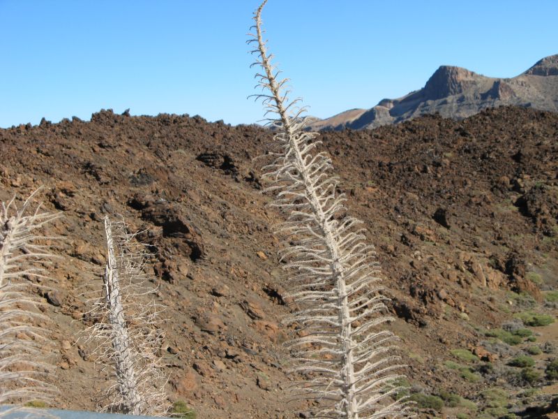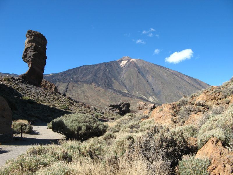 So gestärkt spazieren wir durch die Straße mit den Balkonhäusern und danach zum Auto. Jetzt gehst weiter immer höher hinauf Richtung Teide. Der Vulkan ist mit 3.717m der höchste Berg Spaniens. Bergunerfahrene Touristen werden durch regelmäßige Warnschilder vor Schneefall und Straßenglätte gewarnt. Zur Zeit ist es aber noch viel zu warm für Schnee. Aufgrund der Inversionswetterlage kann man den Gipfel des Teide erst sehen, als wir durch die Wolken durchgefahren und wieder im Sonnenschein angekommen sind. Die Straße führt durch Kraterlandschaft aber nicht ganz hinauf zum Gipfel. Da gibt es eine Seilbahn, die etwas höher hinauf fährt, ganz zum Gipfel darf man aber nur mit einer speziellen Erlaubnis, die wir nicht eingeholt haben. Am großen Parkplatz am Fuße des Gipfels bei den Roques de Garcia bleiben wir stehen und gehen einen Fußweg zwischen verschiedenen Steinformationen ein Stück bergan. Auf Tafeln sind der Verlauf des Vulkanausbruches und die Steinformationen erklärt. So gibt es eine sogenannte Kathedrale und den berühmten Roque Cinchado, der aus verschiedenen Gesteinsschichten besteht, die unterschiedlich schnell korrodieren. Hier sind unten die weichsten Schichten, die zum Großteil schon verschwunden sind. Deshalb wird er irgendwann unter seiner Last zusammenbrechen.