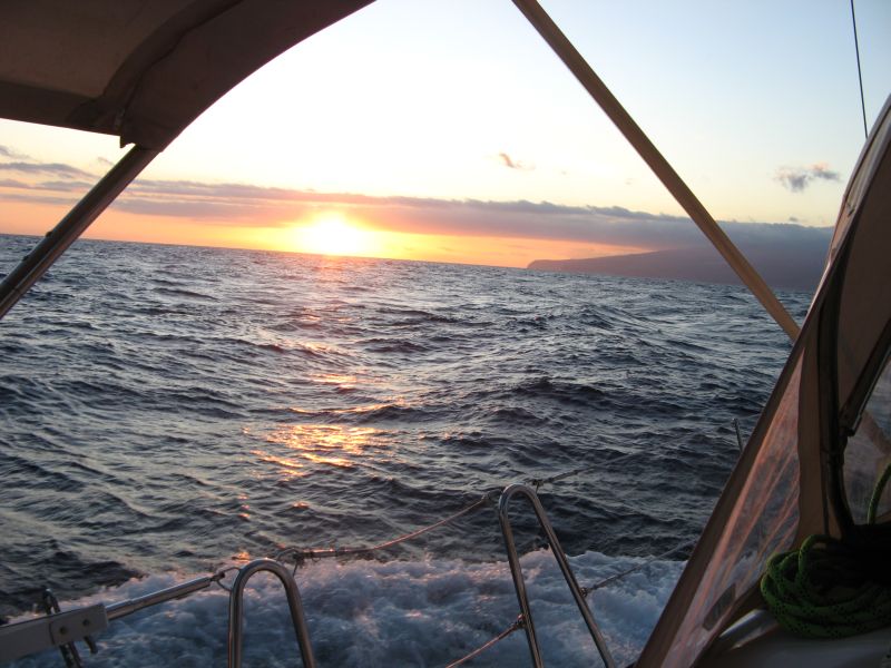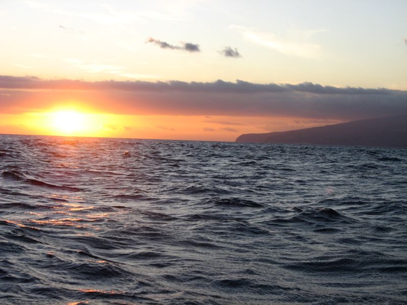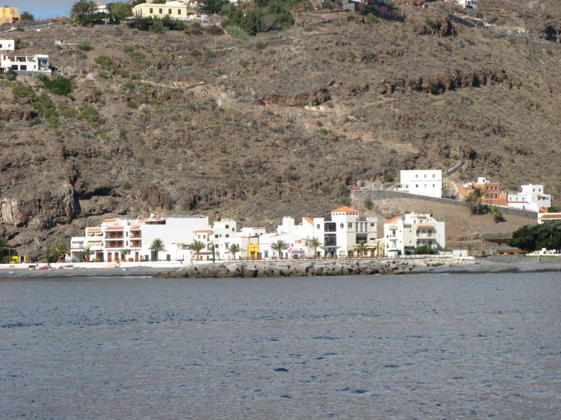 Sonntag Mittag nach einer kurzen Runde Schwimmen im Meer lichten wir den Anker und steuern La Gomera, die etwa 20 Seemeilen entfernte kleine Nachbarinsel an. Zuerst ist der Wind gut, doch am späten Nachmittag schläft er ein und wir müssen ein Stück motoren. Doch sobald wir in die Düse zwischen Teneriffa und Gomera kommen, werden Wind und Wellen ständig stärker, sodass wir sogar 3 Reffs in die Segel machen müssen. Wir ankern schon im Finstern in einer einsamen Bucht kurz vor Playa de Santiago. Am nächsten Morgen schwimmen wir wieder im kalten Atlantik, danach besichtigen wir noch vom Schiff aus Playa de Santiago, wo ich vor ca. 15 Jahren auf Urlaub war, bevor wir das kurze Stück in den Hafen von San Sebastian fahren, in dem wir zu Mittag anlegen.