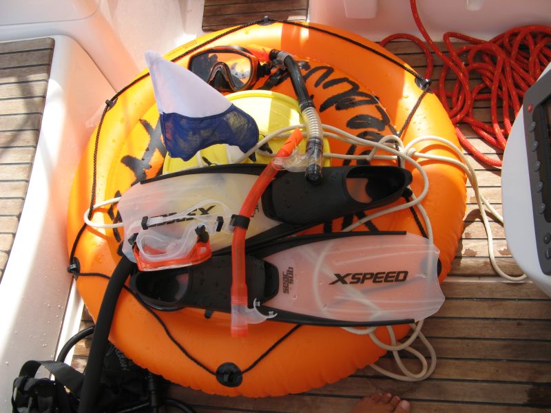 Monika und ich tauschen die Rollen. Ich gehe zurück an Bord und sie versucht tief genug zu tauchen, um sehen zu können was los ist. Doch auch diese Versuche blieben erfolglos. Wir entscheiden uns daher, unseren „Freediver“ auszupacken. Es handelt sich um ein Tiefschnorchelsystem, das wir in dem Bericht über Ibiza schon erwähnt haben. Ich hoffe, dass ich bei einem langsamen Abtauchen den Druckausgleich schaffen würde. Leider wird auch dieser Versuch nicht mit dem entsprechenden Erfolg belohnt. Ich komme jedoch tief genug um zu sehen, dass unsere Kette sich nicht um den Felsen gewickelt hat, dies erklärt wieso unsere ersten „Befreiungsversuche“ nicht funktioniert haben.