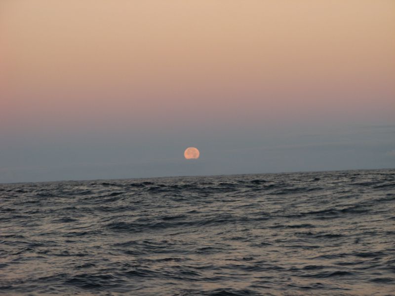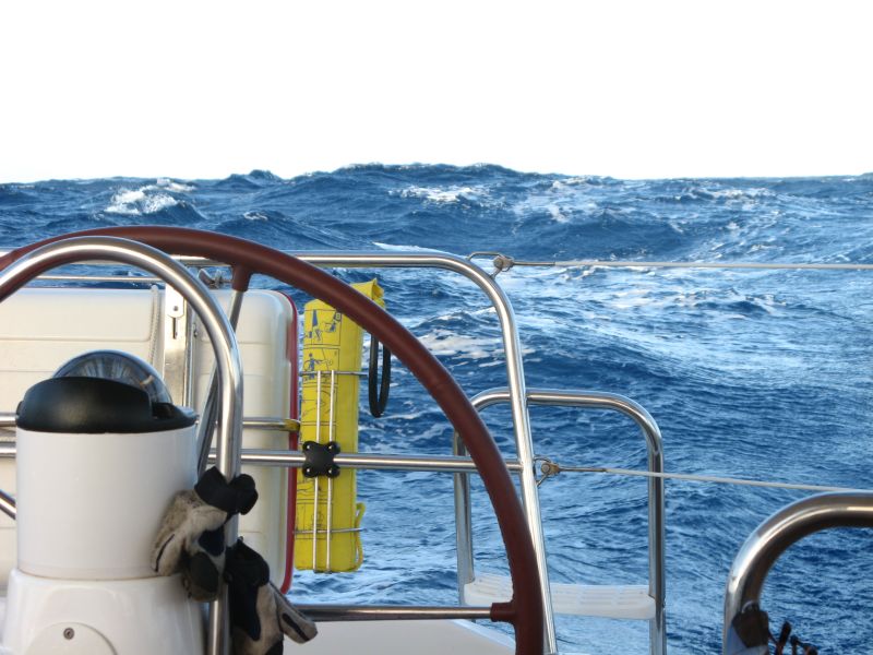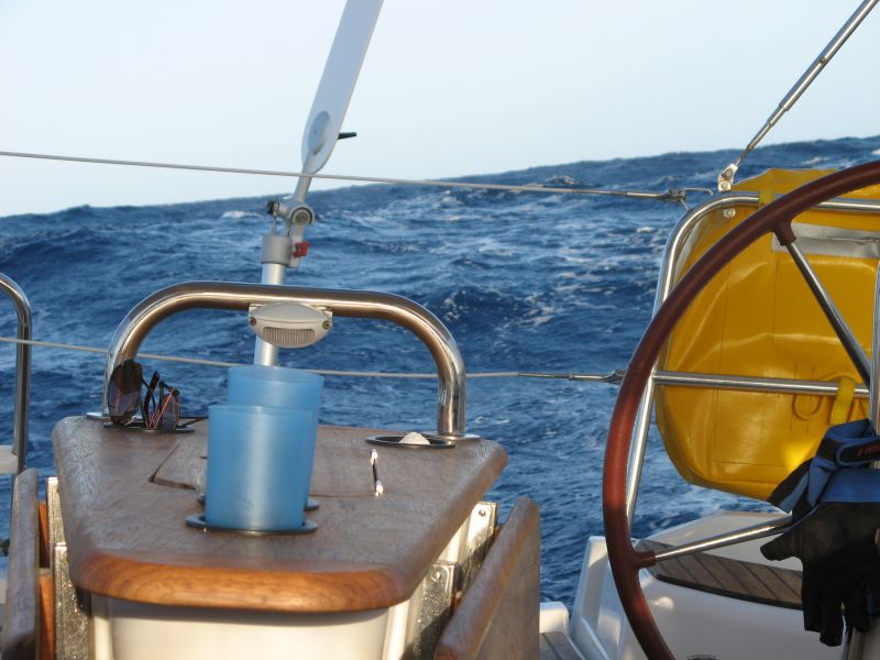 Die ersten zwei Stunden müssen wir unter Motor zurücklegen, weil es keinen Wind gibt. Dies ändert sich doch rasch. Die ersten Tagen kommen wir sehr gut voran. Wir haben teilweise bis zu 23 Knoten Wind (Windstärke 6) und die Böen erreichen 26-27 Knoten. Die entsprechenden Wellen mit einer Höhe von ca. 4-5 Meter kommen auch noch dazu. Es ist trotzdem nicht unangenehm, da es ein achterlicher Wind ist und die Welle relativ lang gezogen sind.