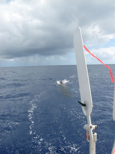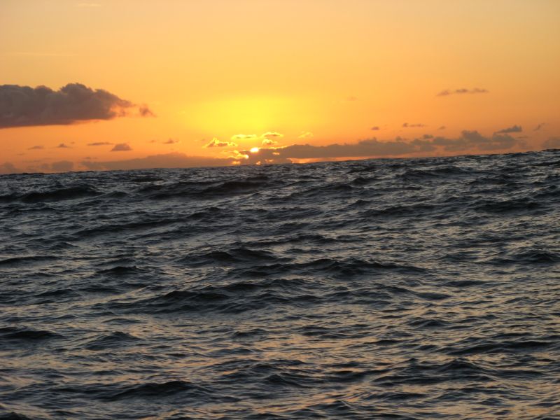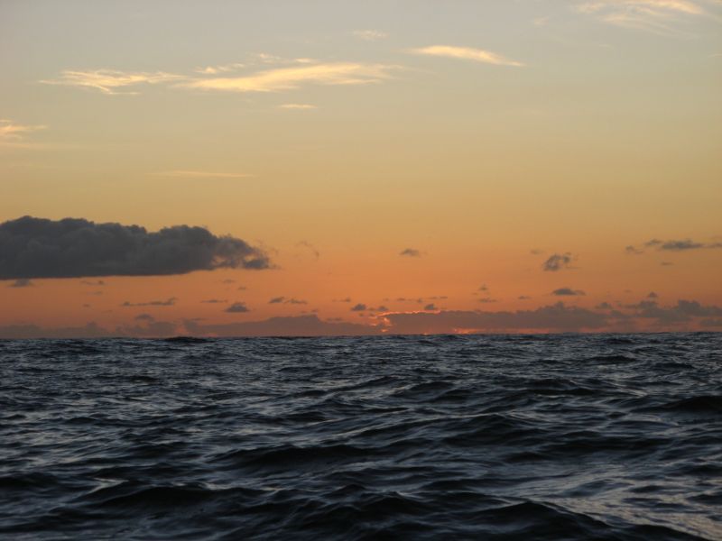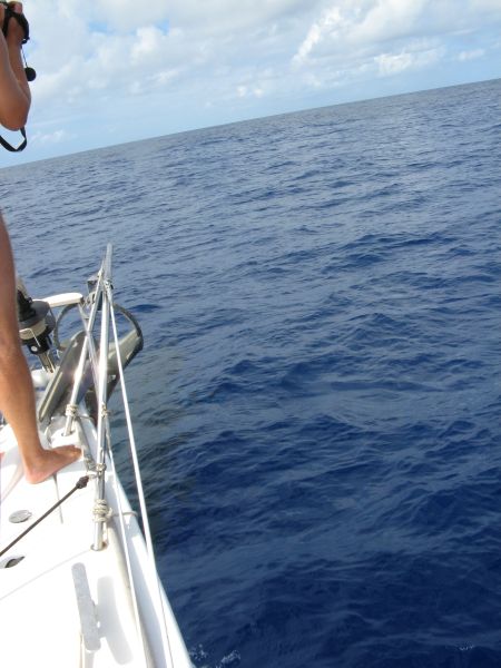 Am 27. Januar 2010 um ca. sieben Uhr dümpeln wir mit wenig Wind durch eine Schule schlafender Delfine. Es ist ein ungewohnter Anblick dieser Tiere, die sonst immer so spielerisch ums Boot herum schwirren. Sie lassen sich einfach von der Strömung treiben. Nur zum Luft holen bewegen sie sich mit langsamen Flossenschlägen zur Wasseroberfläche hinauf. Wie in Zeitlupe. Es sieht so aus als würden sie nicht einmal merken, dass wir neben ihnen vorbei segeln.