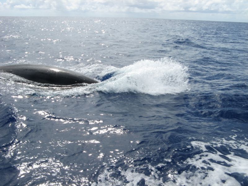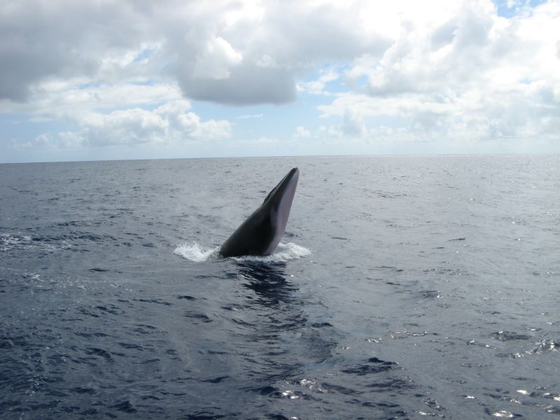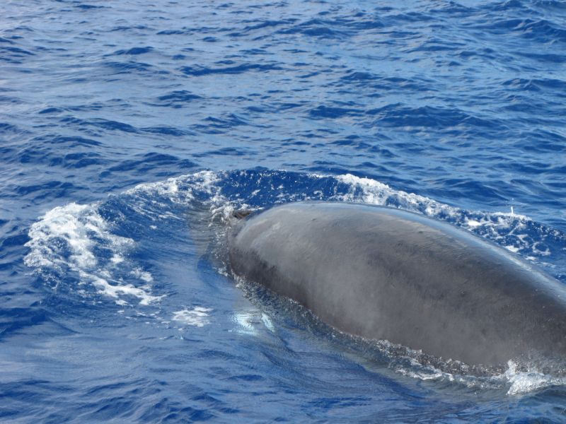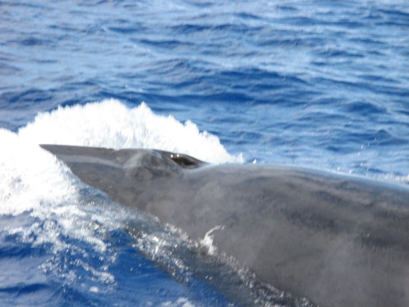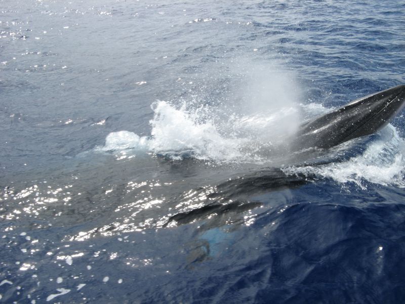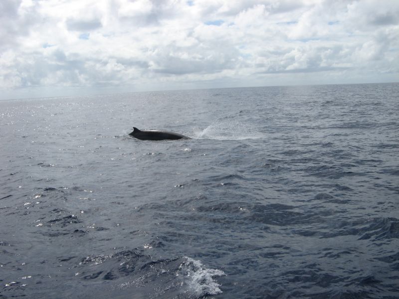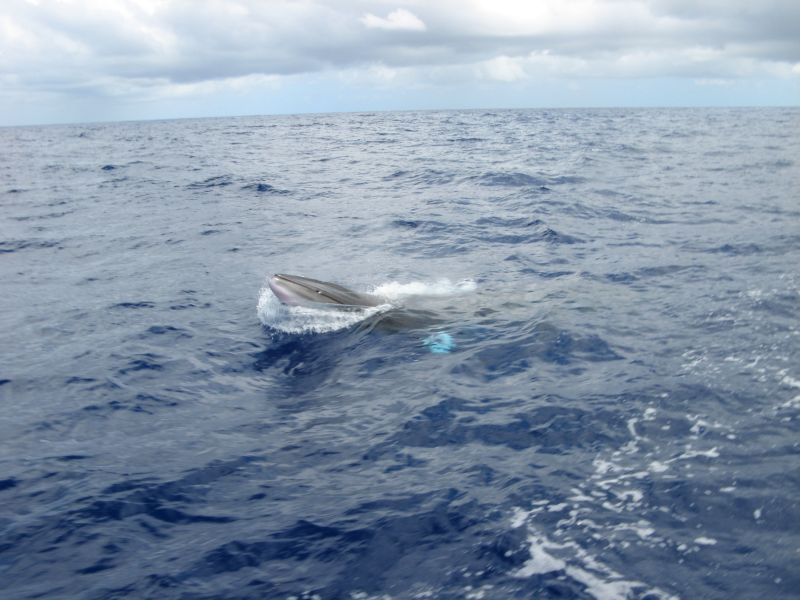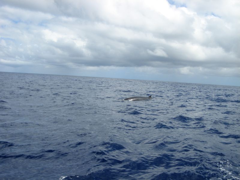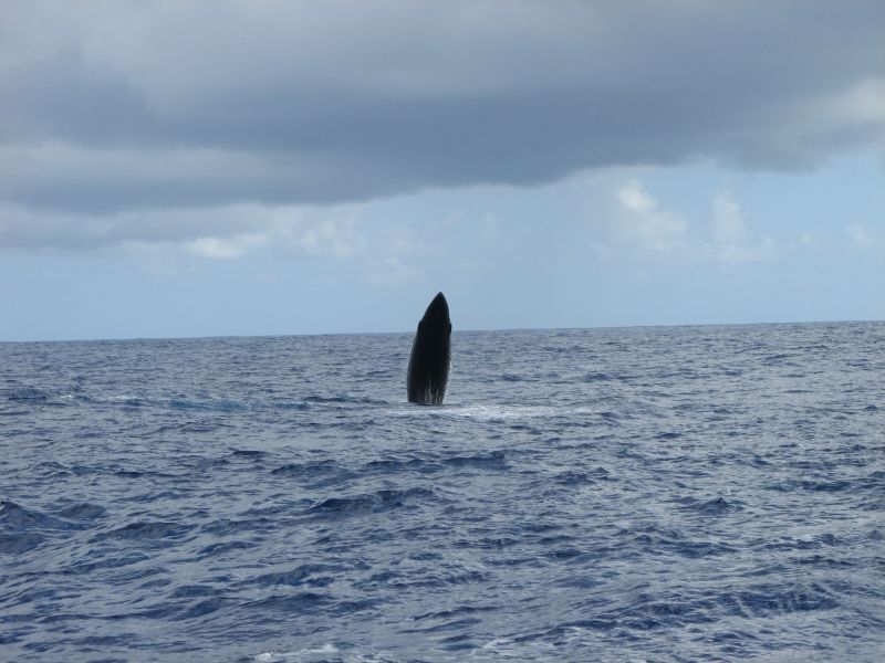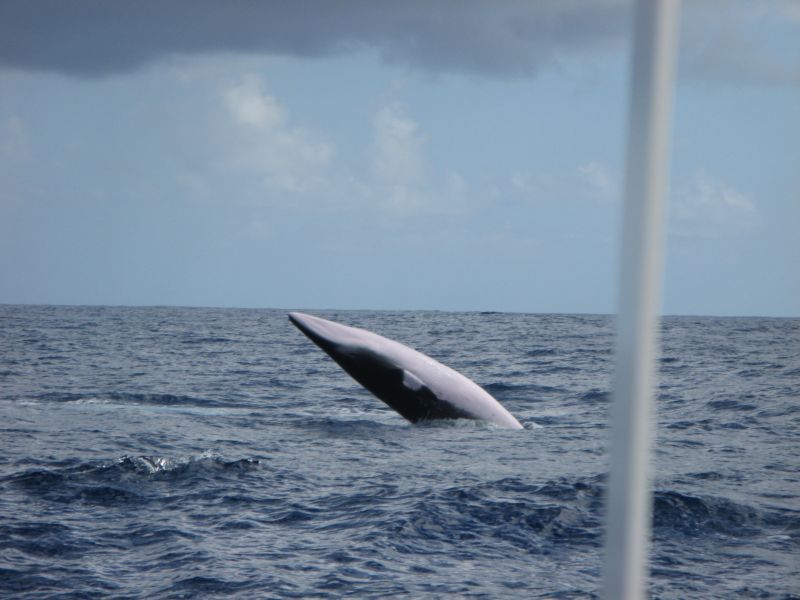 Er schwimmt eine gute halbe Stunden mit uns, wobei er wie die Delphine aus dem Wasser springt. Ein Teil dieser Sprünge sind sogar „Rückwärtssaltos“, da er auf dem Rücken landet. Ansonsten gleitet er seitwärts oder wie die Delphine vorne direkt unter unserem Bug im Wasser dahin. Der Anblick ist gewaltig, wie er teilweise nur ca. zwei Metern vor dem Bug oder achteraus schwimmt. Seine Sprünge finden teilweise auch in nur ca. fünf Meter Entfernung statt. Wenn man jetzt noch bedenkt, dass er ca. sieben bis acht Meter lang ist, kann man verstehen wieso wir unter anderem auch ein flaues Gefühl haben.