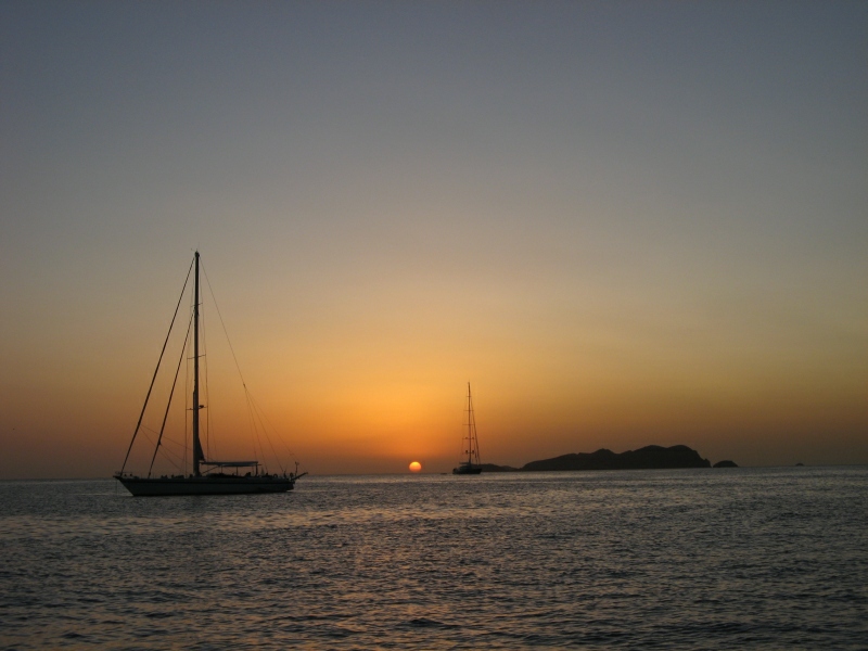 Abhängig davon, welche Wind- und Wellenrichtung vorhergesagt werden und ob wir wieder einkaufen müssen, wechseln wir zwischen einigen Buchten in der Gegend um San Antonio hin und her. Erkunden die Umgebung, fahren mit dem Dinghi in Höhlen, Schwimmen, Schnorcheln, fotografieren ein paar Fische unter Wasser und genießen den täglichen Sonnenuntergang.