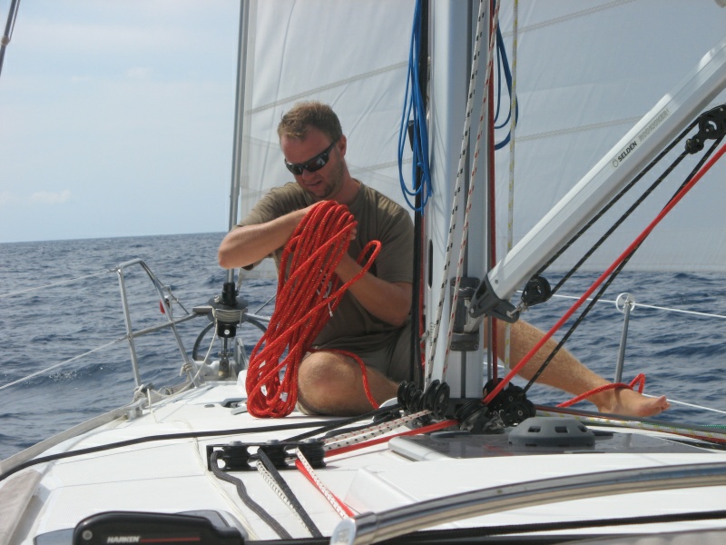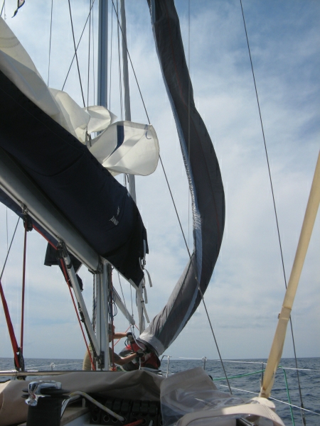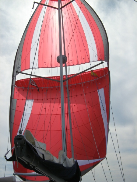 Die Weiterfahrt in die Bucht von Almeria verläuft gemütlich. Wir versuchen zum ersten mal unseren Parasail zu setzen. Doch der Wind ist dafür zu stark und wir haben große Mühe, das riesige Segel wieder einzuholen. Ich laufe hinten zwischen den Winschen hin- und her, während Eric die letzten Quadratmeter in den Bergeschlauch stecken möchte, doch die Wellen schaukeln das Boot so stark von einer Seite auf die andere, dass er nur eine Hand frei hat, weil er die zweite zum Festhalten benötigt. Ich muss also auch nach vorne und gemeinsam gelingt es uns, das widerstrebende Tuch wegzuräumen. Nachdem der Wind jedoch nachlässt, probieren wir es nochmals und diesmal gelingt es uns auch, wie es die Fotos beweisen.