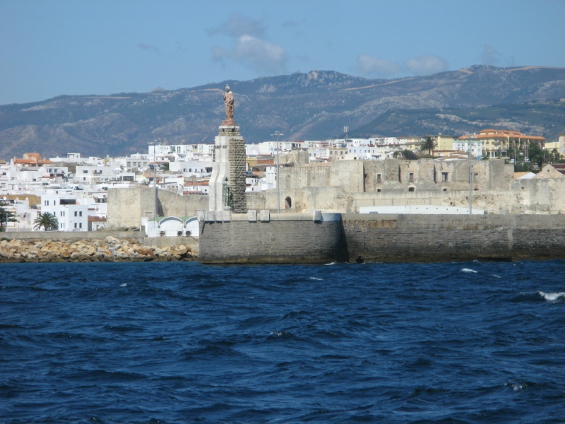 Am nächsten Tag warten wir den Zeitpunkt ab, ab dem Strömung laut Handbuch aus dem Mittelmeer Richtung Atlantik fließen soll. Doch zu unserem großen Erstaunen haben wir eine Gegenströmung von 2,5 Knoten, die zwar langsam abnimmt aber erst nach gut 3 Stunden in unsere Richtung geht. Den Grund dafür wissen wir bis heute nicht. Aber wenigstens der Wind weht wie gewünscht und angesagt von hinten, nur geringe Wellen und so kommen wir trotzdem gut voran. Wir segeln bis Tarifa, wo wir am späten Nachmittag noch die Altstadt besichtigen und einkaufen. Bei der Rückfahrt müssen wir uns beeilen, das Dinghi ins Wasser zu lassen, da heftige Wellen anrollen. Trotzdem werden wir von der dritten Welle regelrecht geduscht und waren von Kopf bis Fuß nass. Nur danach kam erstaunlicherweise keine einzige Welle mehr. Die Einheimischen haben sich wahrscheinlich krumm gelacht.