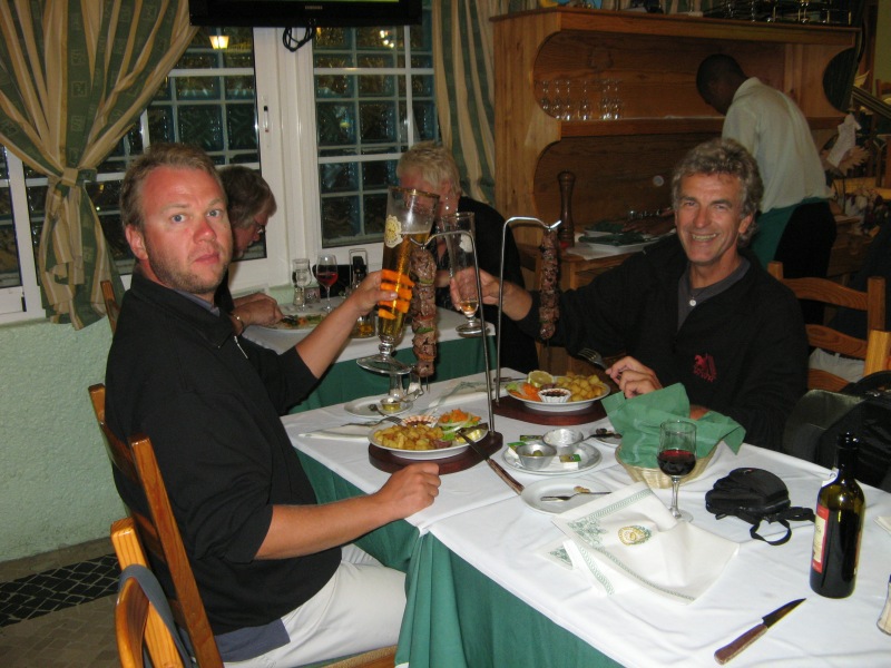 Zurück in Denia starten Gaby und Thomas wieder das bewährte TO-Betreuungsprogramm. Auch ein Feuerwerk fehlt nicht. Und trotz eines Muskelrisses im Oberschenkel begleitet mich Gaby drei Tage lang beim Einkaufen. Sogar auf den Markt, obwohl ich beim letzten mal am Gemüsestand 10 Minuten zum Aussuchen dreier Zwiebel benötigte. Trotzdem erbleicht sie, als ich sage, dass ich 4 Kilo Babykartoffeln kaufen werde und sie versucht hochzurechnen, wie lange ich dafür brauchen werde. Zu ihrer Erleichterung lasse ich den Händler auswählen. Währenddessen üben Eric und Thomas das Segeln mit dem neuen Parasail, das ist ein spezieller Spinnaker und besorgen, was am Boot noch fehlt. An einem Abend fahren wir zu einer Quelle, die heilende Kräfte haben soll und am letzten Abend besuchen wir noch ein Rockcafé, in dem eine Gruppe live uralte Rockhits spielt. Wir können jeden Song mitsingen und haben riesigen Spaß. Zum Abschied schenken sie uns noch ein Kochbuch: „Der Koch ist Kapitän“ mit Rezepten und Anekdoten, die die Autoren während ihrer Weltumseglung gesammelt haben. Damit es bei uns nicht immer nur Nudeln mit Tomatensauce gibt.