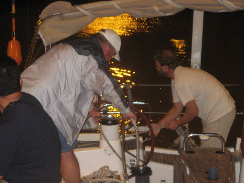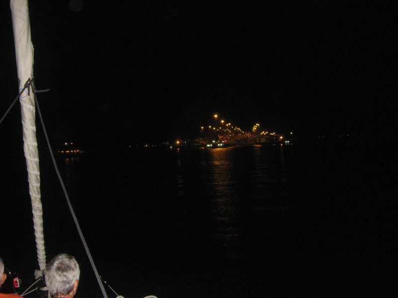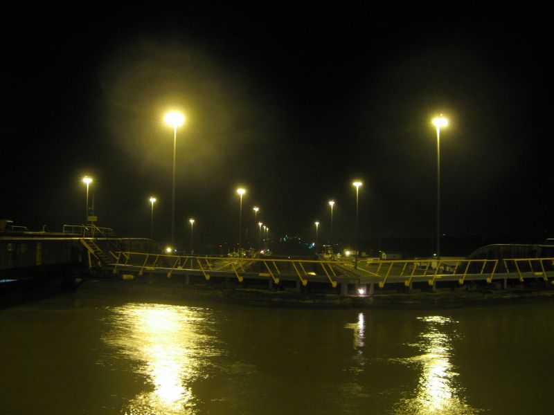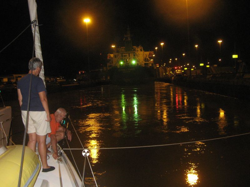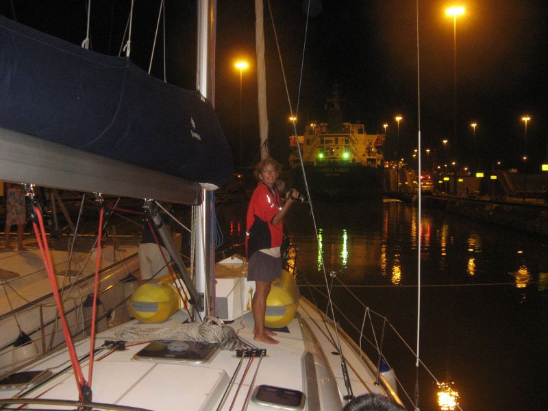 Es ist soweit. Alles ist bereit nur Helga und Rene sind noch nicht aus Panama City eingetroffen. Es gibt einen Streik auf der Verbindungsstraße nach Colon. Doch bevor unser Stresslevel in die Höhe steigt, treffen sie ein und wir können uns auf die Flats, den Ankerplatz vor dem Kanal, verlegen, um auf den Adviser zu warten, der für 16 Uhr angekündigt ist. Kaum angekommen teilt man uns mit, dass der Termin um eine Stunde nach hinten verschoben wird. Doch auch der neue Termin vergeht. Erst gegen 18:30 Uhr nähert sich ein Launchboat und versucht offensichtlich unseren Schiffsnamen zu entziffern. Doch nach einer Runde um Aroha dreht es ab und einer ruft zu unserem Entsetzen „mañana“. Darauf melden wir uns sofort bei der „Cristobal Signal Station“, um zu erfahren, dass es nur ein blöder Scherz war. Kurz danach kommt auch schon das Boot, wird gekonnt heran gesteuert und der Adviser springt an Bord. Wir lichten den Anker und nähern uns der Schleußeneinfahrt. Mittlerweile informiert uns der Adviser, dass wir gemeinsam mit einem großen Segelkatamaran im Päckchen geschleust werden. Trotz der bereits eingebrochenen Dunkelheit ist die Gatunschleuße gut zu erkennen, sie ist taghell erleuchtet. Wieder müssen wir warten, weil es beim Frachter der gleichzeitig durchfährt ein Problem gibt. Die Spannung steigt, wir werden immer nervöser. Denn es gehen natürlich zahlreiche Geschichten um, auf wie vielfältige Weise man sein Boot beim Transit beschädigen kann.