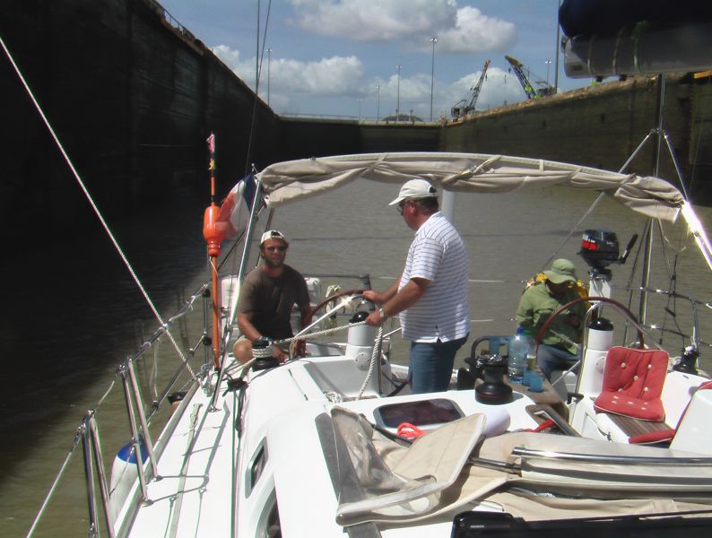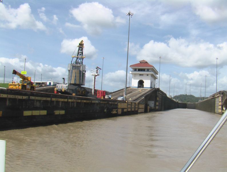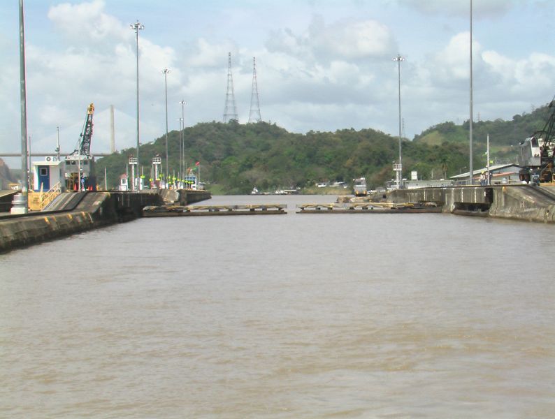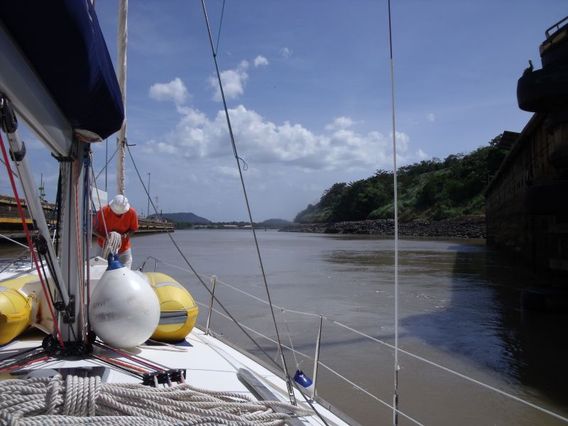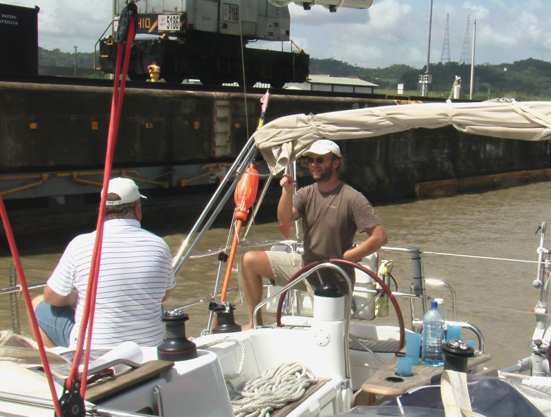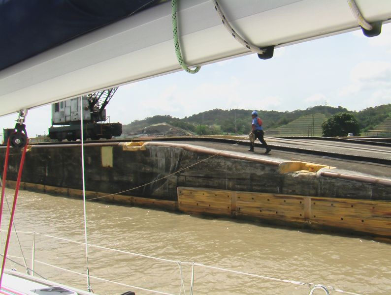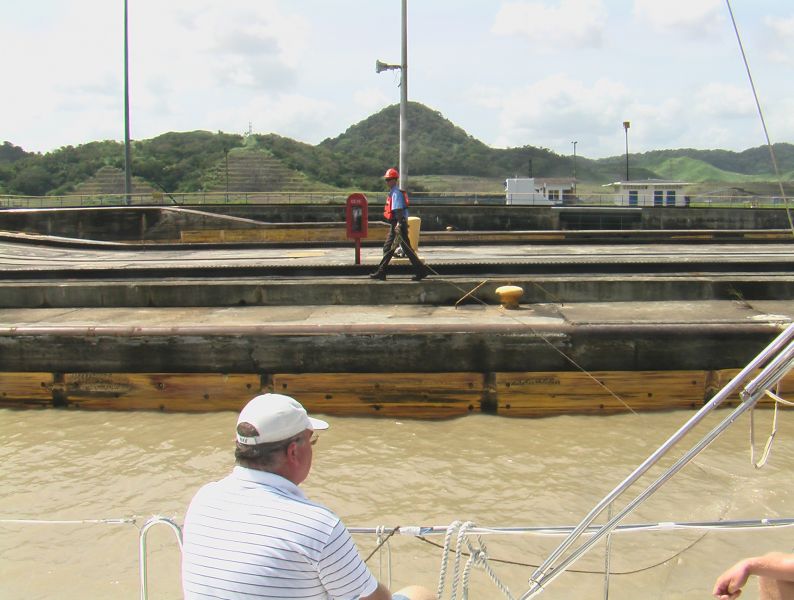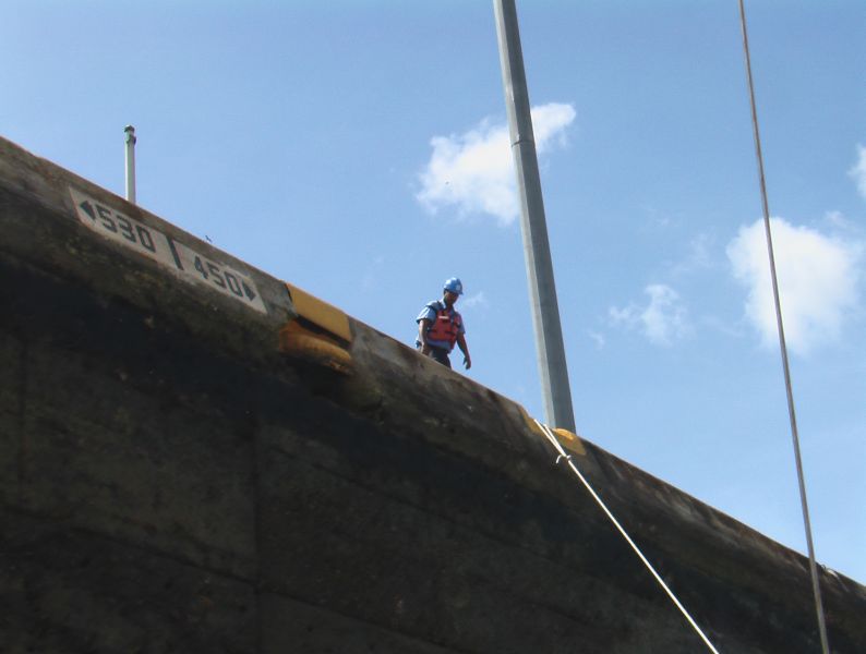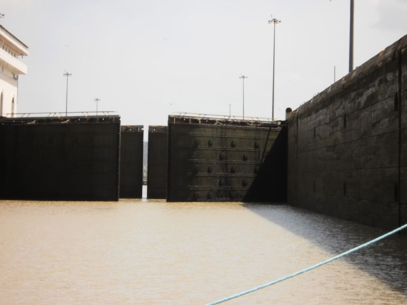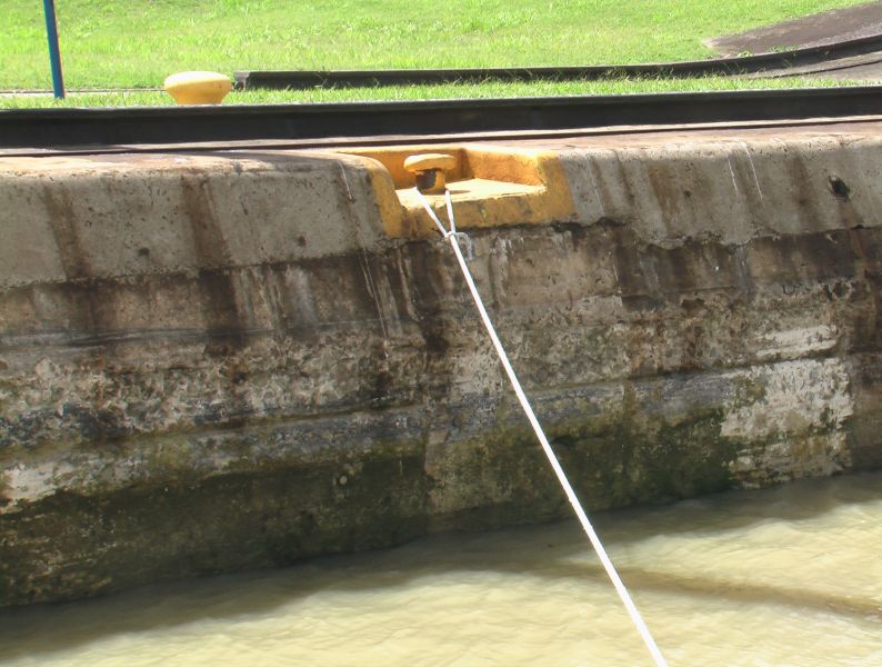 Nachdem das Frachterproblem erledigt wurde, bilden wir mit dem Katamaran das Päckchen. Dabei werden die Boote seitwärts mit Festmacherleinen aneinander gebunden. Wie vorgeschrieben haben wir zusätzlich Autoreifen als Bollwerke, der Kat verlässt sich allein auf seine Fender. Ich bin ab jetzt beinahe arbeitslos, da die Steuerung vom größten Boot durchgeführt wird. Ich muss manchmal mit unserem Motor auf Anweisung des Advisers mit Korrekturschüben unterstützen. Während wir in den ersten Schleußenabschnitt einfahren, werden uns die sogenannten Affenfäuste entgegengeworfen, an den wir unsere Leinen befestigen müssen. Damit werden sie an Land gezogen und an der entsprechenden Stelle befestigt. Nach kurzer Zeit ist die erste Hürde genommen und wir liegen schön mittig in der Kammer befestigt. Hinter uns schließen sich die gewaltigen Schleusentore. Kaum geschlossen beginnt das Wasser rasch zu steigen. Jetzt sind die Linehandler gefragt. Sie müssen dafür sorgen, dass das Päckchen immer schön in der Mitte bleibt, was nicht so einfach ist, wie es klingt. Da es starke Verwirbelungen im Wasser gibt, ruckt es heftig in die eine oder andere Leine. Da muss man auf Finger und Hände achten, denn ein Unfall ist schnell passiert. Oben angekommen werden die Leinen gelöst und wir fahren in die nächste Kammer vor, wobei die Schleußenarbeiter die dünnen Leinen mitnehmen. Wir machen wieder fest und das vorherige Prozedere wiederholt sich hier und in der dritten Kammer. Überglücklich, dass wir keinen Schaden genommen haben, verlassen wir die Schleuse, doch bevor wir das Päckchen lösen können, rast ein Tugboat mit voller Geschwindigkeit an uns vorbei. Durch dessen Wellen werden unsere beiden Boote derartige durch geschaukelt, dass sie mehrmals so heftig aneinander gedrückt werden, dass die Fender völlig flach gepresst werden. Erleichtert stellen wir fest, dass es außer ein paar oberflächlichen Kratzern an unserer Bordwand keine weiteren Schäden gibt.