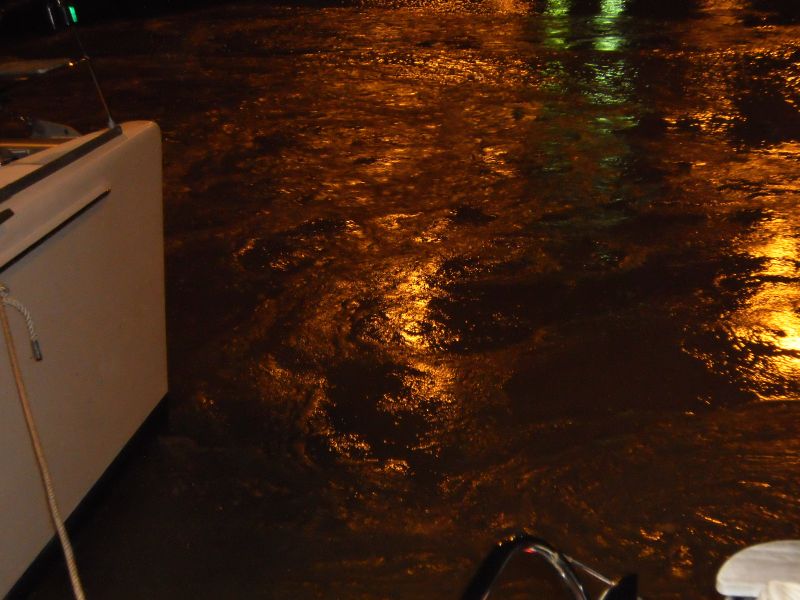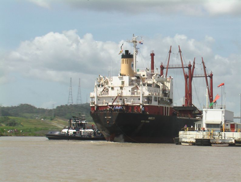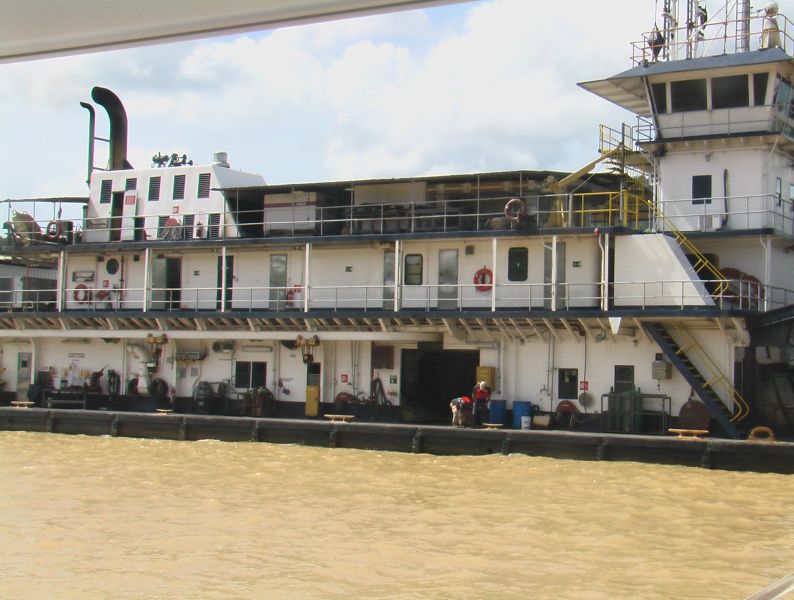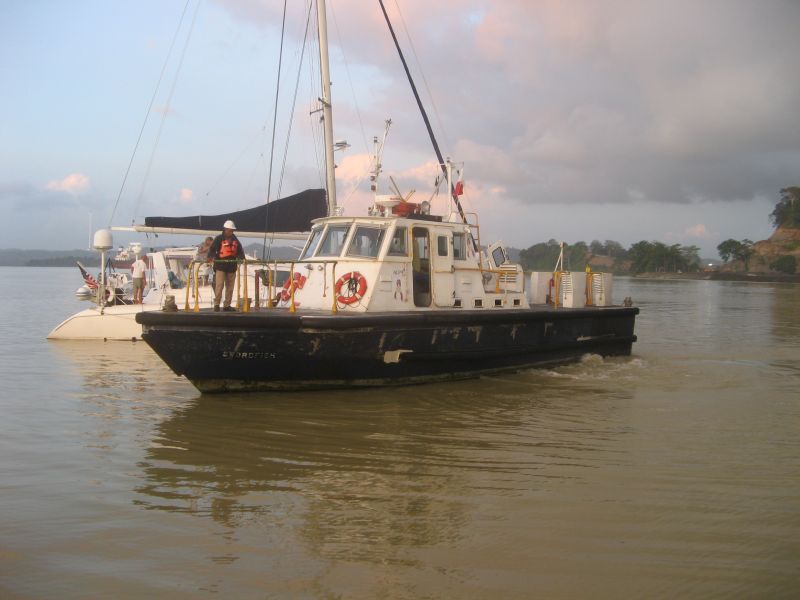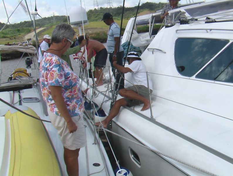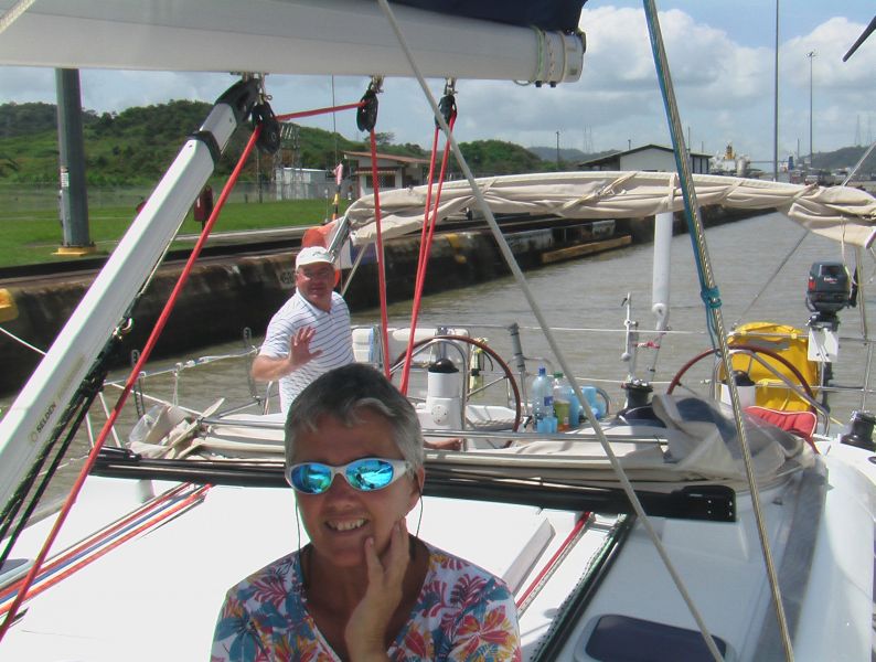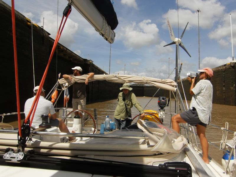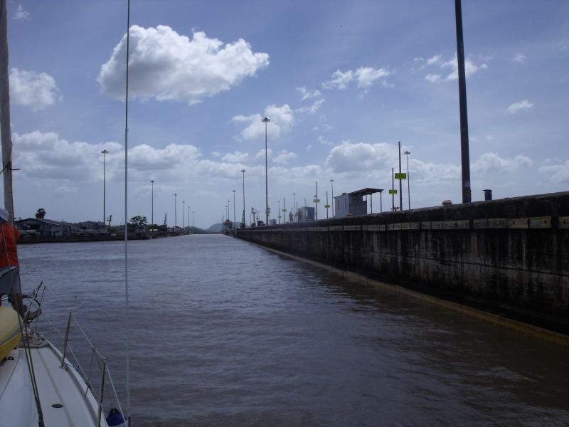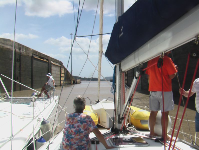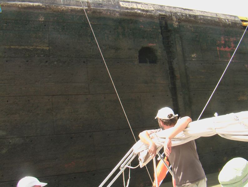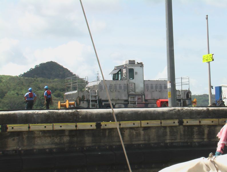 Nachdem das Frachterproblem erledigt wurde, bilden wir mit dem Katamaran das Päckchen. Dabei werden die Boote seitwärts mit Festmacherleinen aneinander gebunden. Wie vorgeschrieben haben wir zusätzlich Autoreifen als Bollwerke, der Kat verlässt sich allein auf seine Fender. Ich bin ab jetzt beinahe arbeitslos, da die Steuerung vom größten Boot durchgeführt wird. Ich muss manchmal mit unserem Motor auf Anweisung des Advisers mit Korrekturschüben unterstützen. Während wir in den ersten Schleußenabschnitt einfahren, werden uns die sogenannten Affenfäuste entgegengeworfen, an den wir unsere Leinen befestigen müssen. Damit werden sie an Land gezogen und an der entsprechenden Stelle befestigt. Nach kurzer Zeit ist die erste Hürde genommen und wir liegen schön mittig in der Kammer befestigt. Hinter uns schließen sich die gewaltigen Schleusentore. Kaum geschlossen beginnt das Wasser rasch zu steigen. Jetzt sind die Linehandler gefragt. Sie müssen dafür sorgen, dass das Päckchen immer schön in der Mitte bleibt, was nicht so einfach ist, wie es klingt. Da es starke Verwirbelungen im Wasser gibt, ruckt es heftig in die eine oder andere Leine. Da muss man auf Finger und Hände achten, denn ein Unfall ist schnell passiert. Oben angekommen werden die Leinen gelöst und wir fahren in die nächste Kammer vor, wobei die Schleußenarbeiter die dünnen Leinen mitnehmen. Wir machen wieder fest und das vorherige Prozedere wiederholt sich hier und in der dritten Kammer. Überglücklich, dass wir keinen Schaden genommen haben, verlassen wir die Schleuse, doch bevor wir das Päckchen lösen können, rast ein Tugboat mit voller Geschwindigkeit an uns vorbei. Durch dessen Wellen werden unsere beiden Boote derartige durch geschaukelt, dass sie mehrmals so heftig aneinander gedrückt werden, dass die Fender völlig flach gepresst werden. Erleichtert stellen wir fest, dass es außer ein paar oberflächlichen Kratzern an unserer Bordwand keine weiteren Schäden gibt.