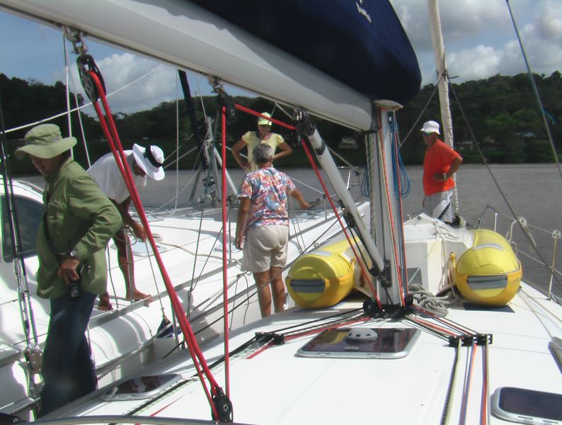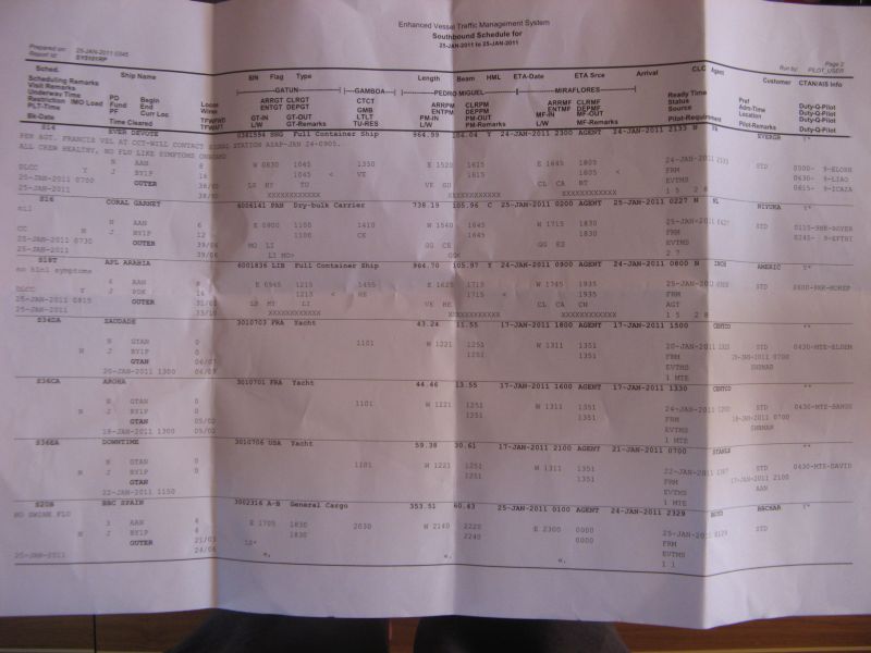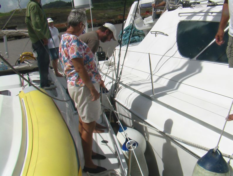Ein weiterer Anruf durch Agent Eric und morgen kommt auch schon der Vermesser zu uns an Bord. Es müssen ein Haufen Formulare über die Ausstattung des Bootes ausgefüllt werden, so muss z.B. für den Adviser, der den Transit begleitet, eine Toilette zur Verfügung stehen. Außerdem gibt es mehrere Arten beim Schleußen: „Centerchamber“, unser Boot alleine mit je 2 Leinen an jeder Seite in der Mitte gehalten, „Nested“, im Päckchen mit 1-2 anderen Booten, „Tugboat“, ein Tugboat wird an der Schleußenwand befestigt und wir legen uns dazu aufs Päckchen, wobei da die Fenderung des anderen Bootes in einer Höhe nach außen geht, dass sie so gegen unsere Reling drücken würde, dass diese sogar abbrechen könnte und „Sidewall“, alleine an einer Wand der Schleuße befestigt, wo das Rigg bei den zu erwartenden Turbulenzen fröhlich an die Wand schlägt. Wir lehnen „Tugboat“ und „Sidewall“ ab.